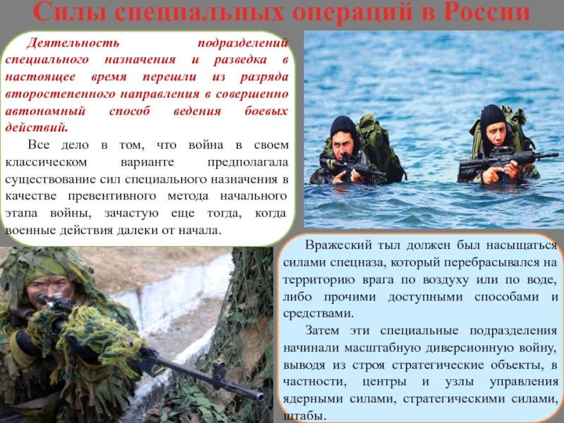 Сравнительно небольшие по численности подразделения всесторонне подготовленных бойцов осуществляют особые операции, связанные с повышенным риском и требующие нестандартных решений.