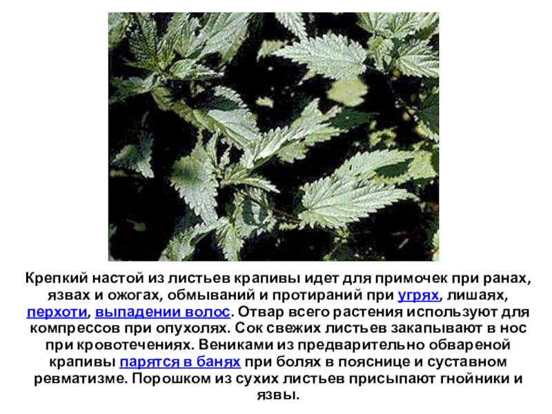 Слайд 13Крепкий настой из листьев крапивы идет для примочек при ранах, язвах