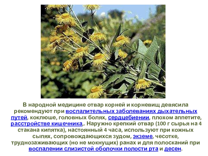 Слайд 8В народной медицине отвар корней и корневищ девясила рекомендуют при воспалительных
