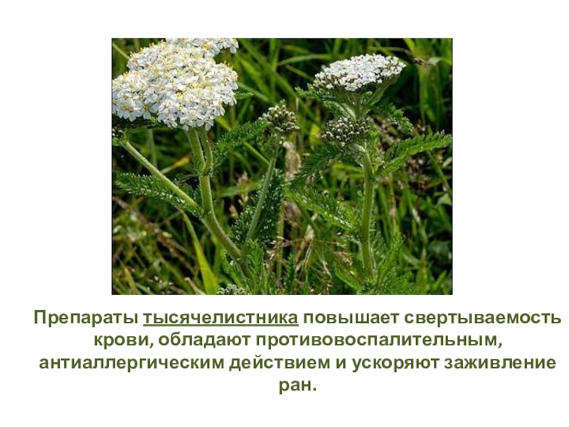 Слайд 5Препараты тысячелистника повышает свертываемость крови, обладают противовоспалительным, антиаллергическим действием и ускоряют