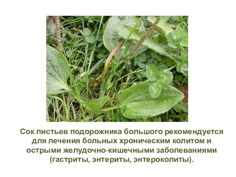 Слайд 15Сок листьев подорожника большого рекомендуется для лечения больных хроническим колитом и