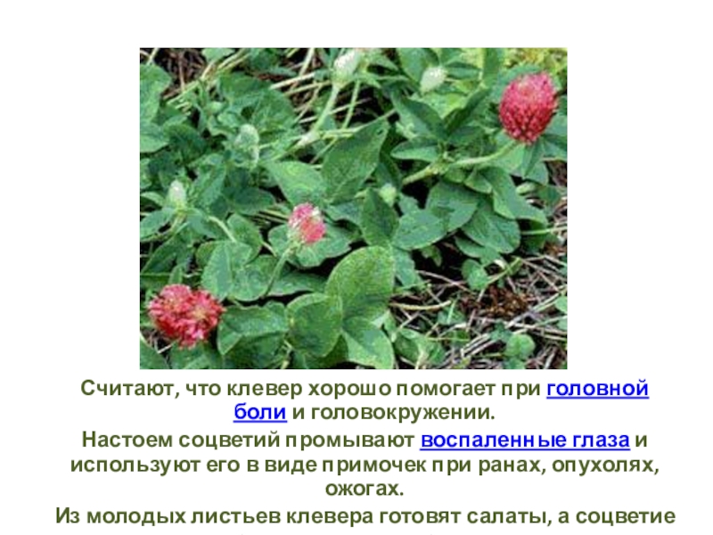 Слайд 9Считают, что клевер хорошо помогает при головной боли и головокружении.