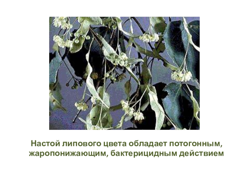 Слайд 10Настой липового цвета обладает потогонным, жаропонижающим, бактерицидным действием
