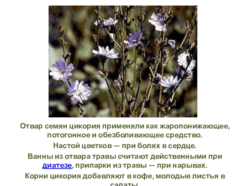 Слайд 4Отвар семян цикория применяли как жаропонижающее, потогонное и обезболивающее средство.