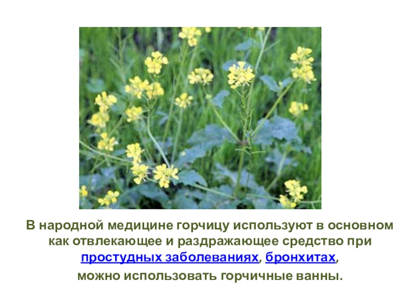 Слайд 6В народной медицине горчицу используют в основном как отвлекающее и раздражающее