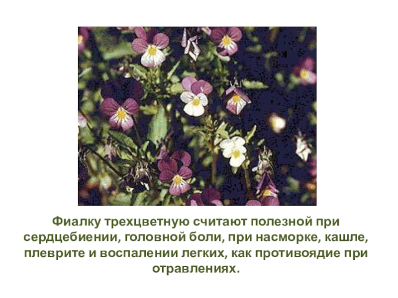 Слайд 12Фиалку трехцветную считают полезной при сердцебиении, головной боли, при насморке, кашле,