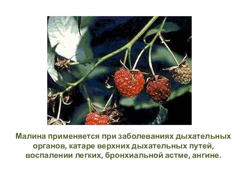 Слайд 11Малина применяется при заболеваниях дыхательных органов, катаре верхних дыхательных путей, воспалении