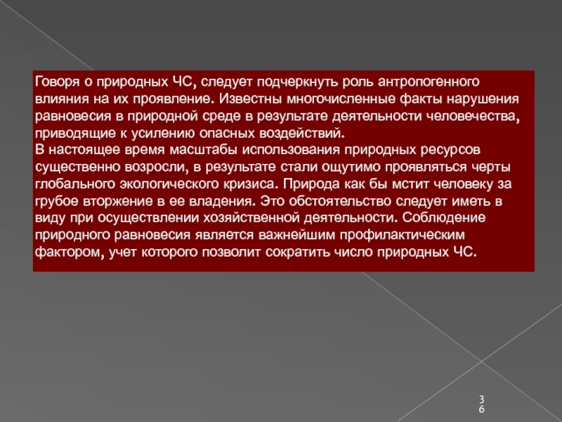 Слайд 36Говоря о природных ЧС, следует подчеркнуть роль антропогенного влияния на их