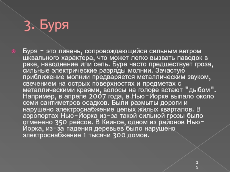 может легко вызвать паводок в реке, наводнение или сель. Буре часто предшествует гроза, сильные электрические разряды молнии. Зачастую приближение молнии предваряется металлическим звуком, свечением на острых поверхностях и предметах с металлическими краями, волосы на голове встают "дыбом". Например, в апреле 2007 года, в Нью-Йорке выпало около семи сантиметров осадков. Были размыты дороги и нарушено электроснабжение целых жилых кварталов. В аэропортах Нью-Йорка из-за такой сильной грозы было отменено 350 рейсов. В Квинсе, одном из районов Нью-Йорка, из-за падения деревьев было нарушено электроснабжение 1 тысячи 300 домов.
