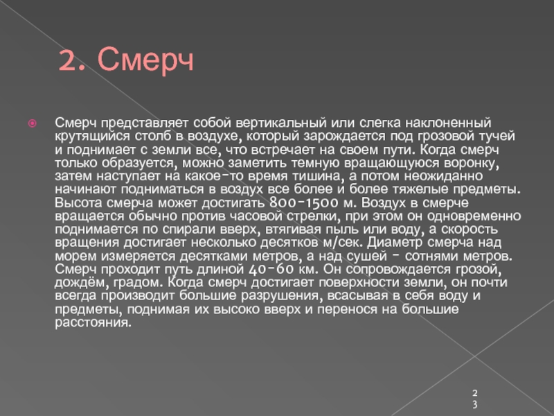 воздухе, который зарождается под грозовой тучей и поднимает с земли все, что встречает на своем пути. Когда смерч только образуется, можно заметить темную вращающуюся воронку, затем наступает на какое-то время тишина, а потом неожиданно начинают подниматься в воздух все более и более тяжелые предметы. Высота смерча может достигать 800-1500 м. Воздух в смерче вращается обычно против часовой стрелки, при этом он одновременно поднимается по спирали вверх, втягивая пыль или воду, а скорость вращения достигает несколько десятков м/сек. Диаметр смерча над морем измеряется десятками метров, а над сушей - сотнями метров. Смерч проходит путь длиной 40-60 км. Он сопровождается грозой, дождём, градом. Когда смерч достигает поверхности земли, он почти всегда производит большие разрушения, всасывая в себя воду и предметы, поднимая их высоко вверх и перенося на большие расстояния.