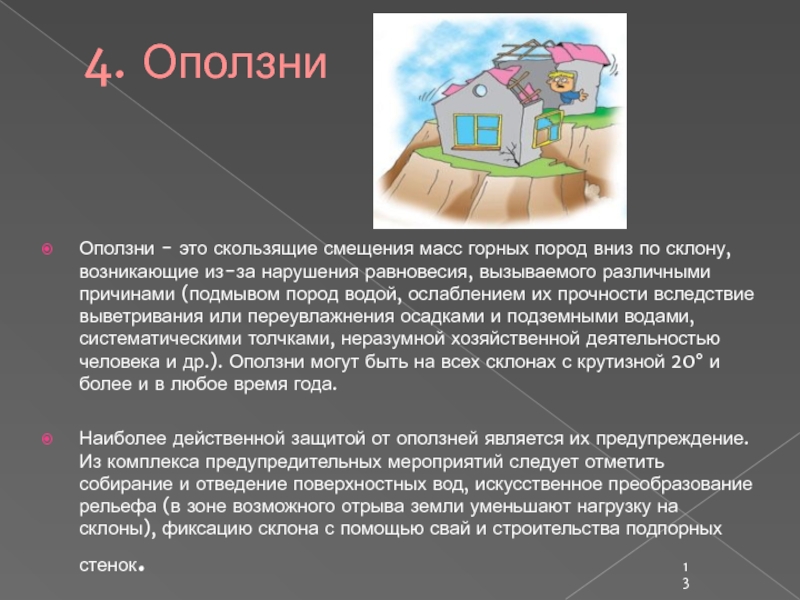 склону, возникающие из-за нарушения равновесия, вызываемого различными причинами (подмывом пород водой, ослаблением их прочности вследствие выветривания или переувлажнения осадками и подземными водами, систематическими толчками, неразумной хозяйственной деятельностью человека и др.). Оползни могут быть на всех склонах с крутизной 20° и более и в любое время года.