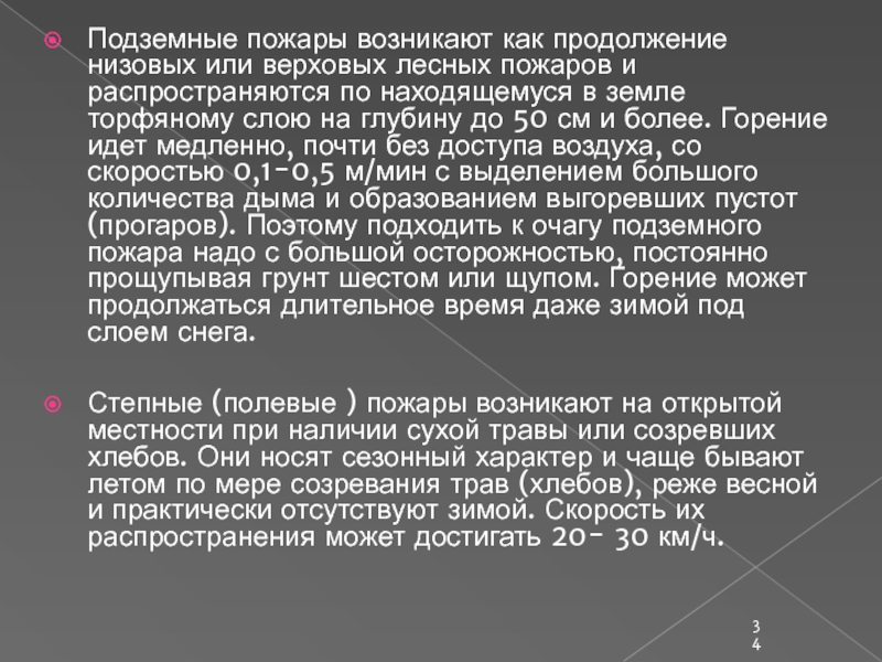 Слайд 34Подземные пожары возникают как продолжение низовых или верховых лесных пожаров и
