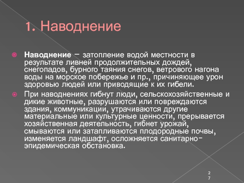Наводнение – затопление водой местности в результате ливней продолжительных дождей,
