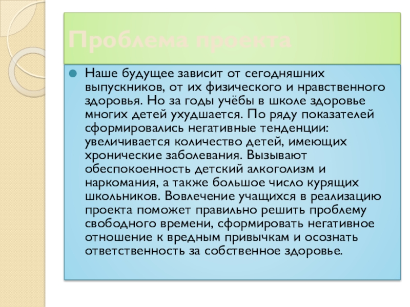 и нравственного здоровья. Но за годы учёбы в школе здоровье многих детей ухудшается. По ряду показателей сформировались негативные тенденции: увеличивается количество детей, имеющих хронические заболевания. Вызывают обеспокоенность детский алкоголизм и наркомания, а также большое число курящих школьников. Вовлечение учащихся в реализацию проекта поможет правильно решить проблему свободного времени, сформировать негативное отношение к вредным привычкам и осознать ответственность за собственное здоровье.