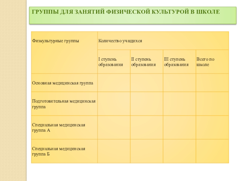выделить несколько групп, в которых используется разный подход к охране здоровья, а соответственно разные методы и формы работы: