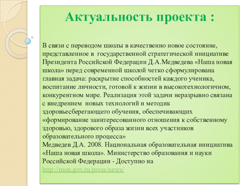В связи с переводом школы в качественно новое состояние, представленное в государственной стратегической инициативе Президента Российской Федерации Д.А.Медведева «Наша новая школа» перед современной школой четко сформулирована главная задача: раскрытие способностей каждого ученика, воспитание личности, готовой к жизни в высокотехнологичном, конкурентном мире. Реализация этой задачи неразрывно связана с внедрением новых технологий и методик здоровьесберегающего обучения, обеспечивающих «формирование заинтересованного отношения к собственному здоровью, здорового образа жизни всех участников образовательного процесса»