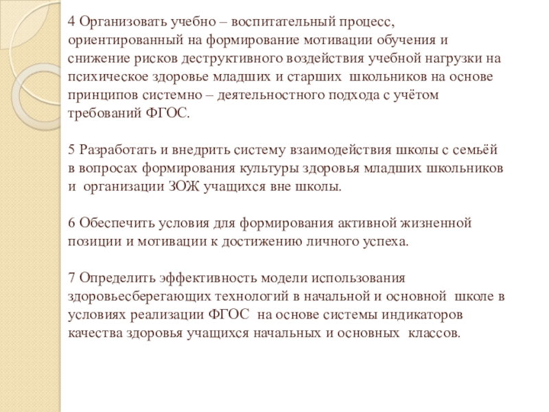 7 Определить эффективность модели использования здоровьесберегающих технологий в начальной и основной школе в условиях реализации ФГОС на основе системы индикаторов качества здоровья учащихся начальных и основных классов.