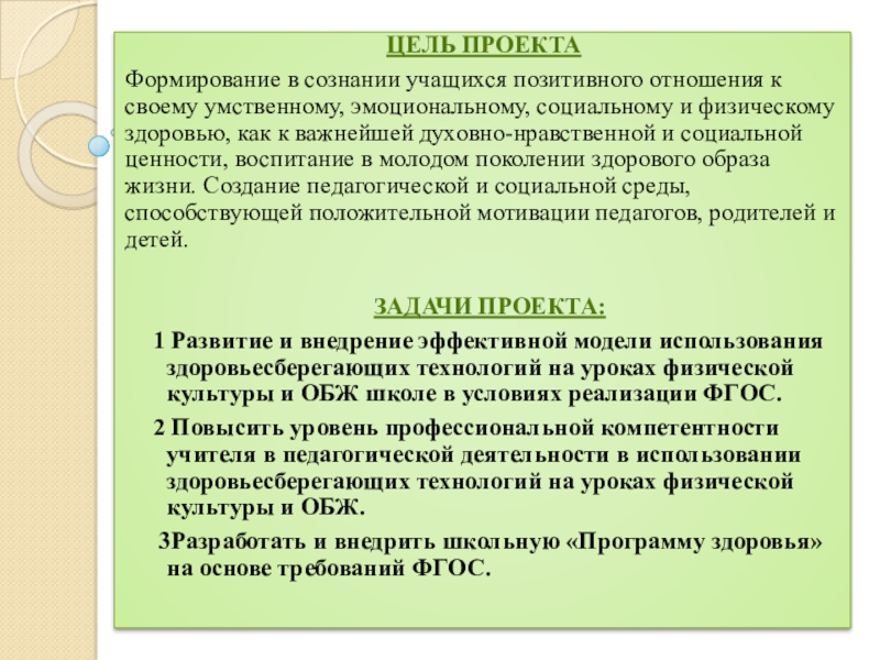 умственному, эмоциональному, социальному и физическому здоровью, как к важнейшей духовно-нравственной и социальной ценности, воспитание в молодом поколении здорового образа жизни. Создание педагогической и социальной среды, способствующей положительной мотивации педагогов, родителей и детей.