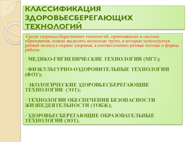· Здоровьесберегающие образовательные технологии (ЗОТ).