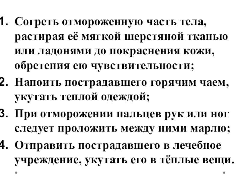 Напоить пострадавшего горячим чаем, укутать теплой одеждой.