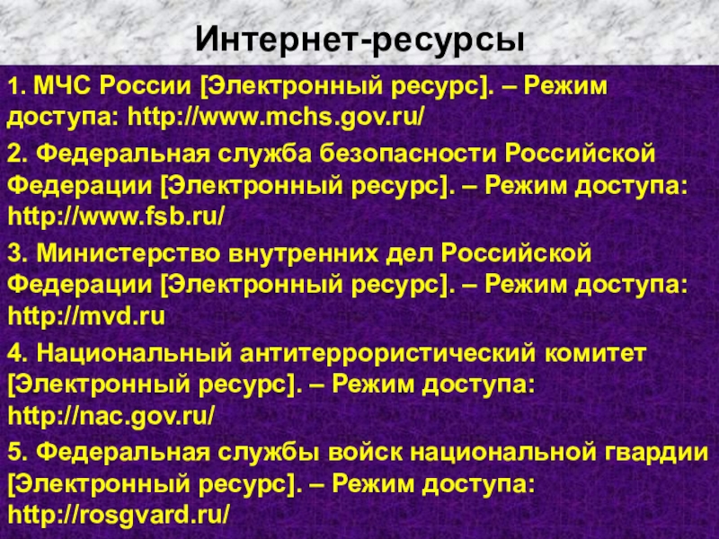 Интернет-ресурсы1. МЧС России [Электронный ресурс]. – Режим доступа: http://www.mchs.gov.ru/2. Федеральная служба безопасности Российской Федерации [Электронный ресурс]. –
