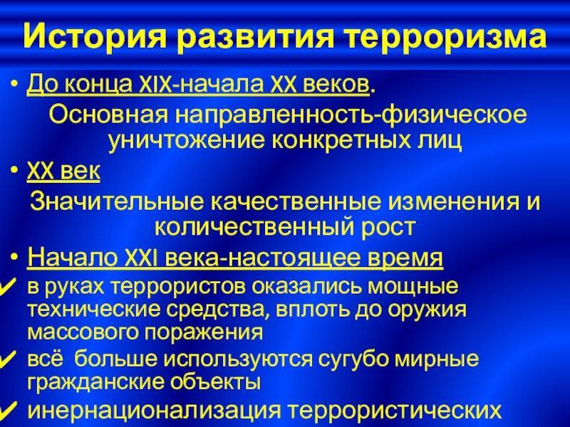 История развития терроризмаДо конца XIX-начала XX веков. Основная направленность-физическое уничтожение конкретных лицXX векЗначительные качественные изменения и количественный