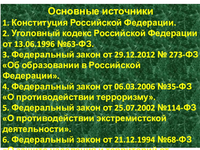 Основные источники1. Конституция Российской Федерации.2. Уголовный кодекс Российской Федерации от 13.06.1996 №63-ФЗ.3. Федеральный закон от 29.12.2012 №