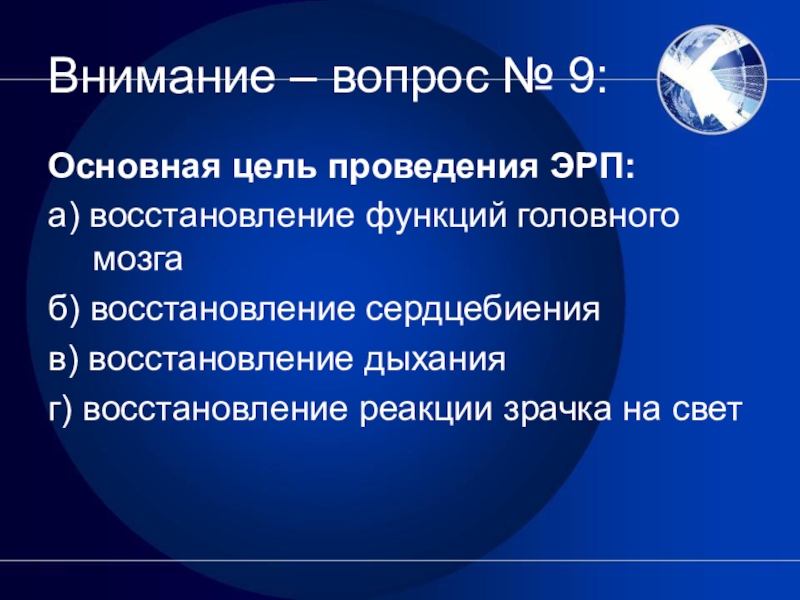 Внимание – вопрос № 9:Основная цель проведения ЭРП:а) восстановление функций головного мозгаб) восстановление сердцебиенияв) восстановление дыханияг) восстановление