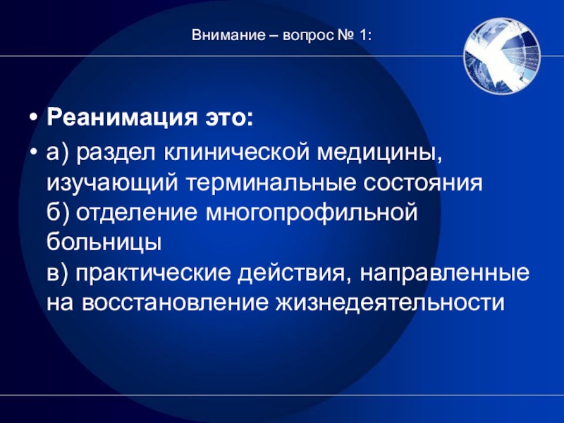Внимание – вопрос № 1:Реанимация это:а) раздел клинической медицины, изучающий терминальные состояния б) отделение многопрофильной больницы в)