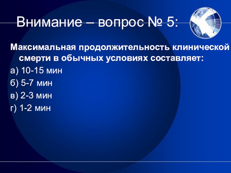 Внимание – вопрос № 5:Максимальная продолжительность клинической смерти в обычных условиях составляет:а) 10-15 минб) 5-7 минв) 2-3