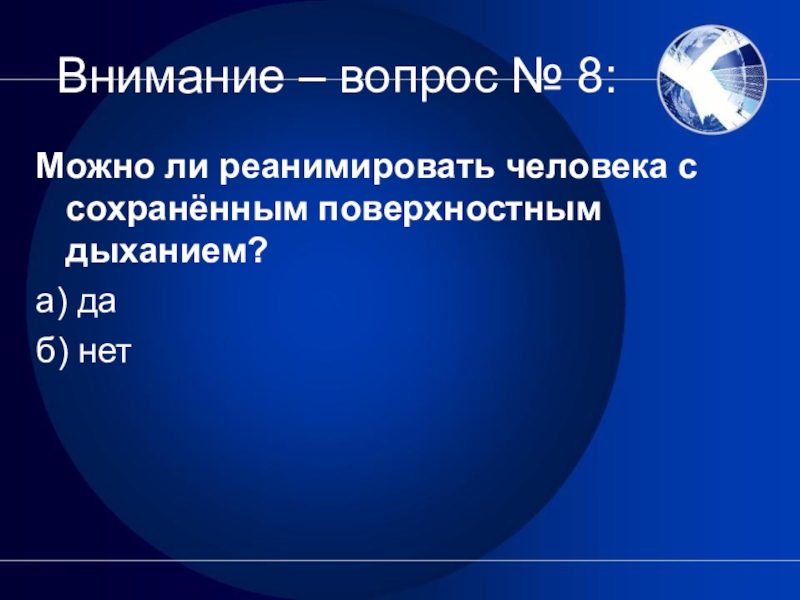 Внимание – вопрос № 8:Можно ли реанимировать человека с сохранённым поверхностным дыханием?а) даб) нет