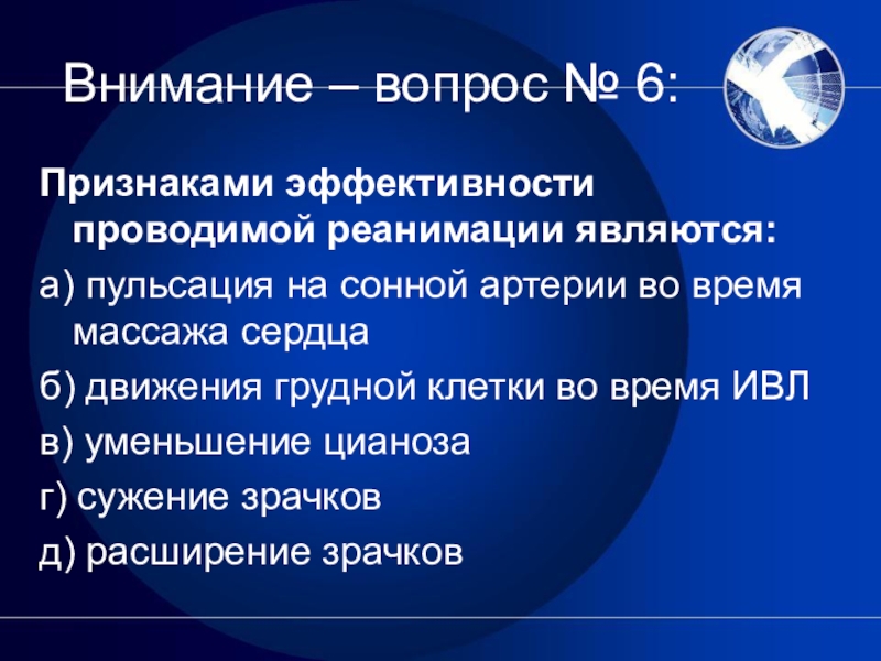 Внимание – вопрос № 6:Признаками эффективности проводимой реанимации являются:а) пульсация на сонной артерии во время массажа сердцаб)