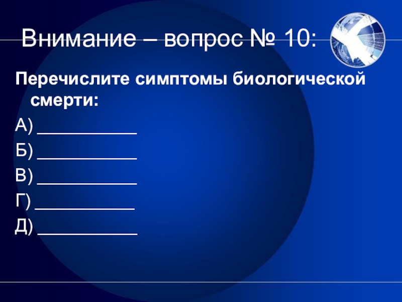 Внимание – вопрос № 10:Перечислите симптомы биологической смерти:А) __________Б) __________В) __________Г) __________Д) __________
