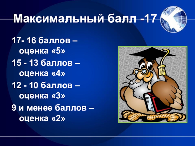 Максимальный балл -17 17- 16 баллов – оценка «5»15 - 13 баллов – оценка «4»12 - 10