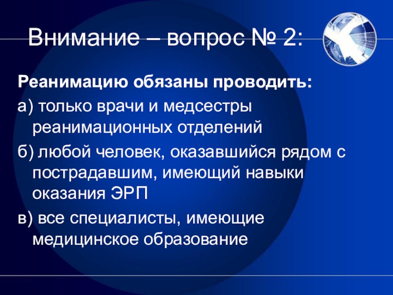Внимание – вопрос № 2:Реанимацию обязаны проводить:а) только врачи и медсестры реанимационных отделенийб) любой человек, оказавшийся рядом