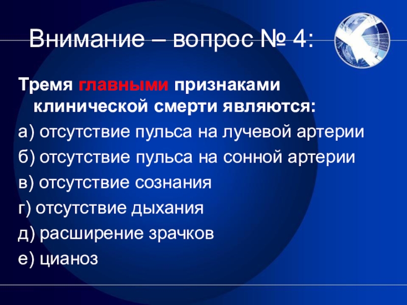 Внимание – вопрос № 4:Тремя главными признаками клинической смерти являются:а) отсутствие пульса на лучевой артерииб) отсутствие пульса