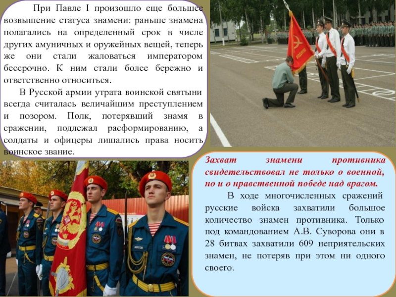 В ходе многочисленных сражений русские войска захватили большое количество знамен противника. Только под командованием А.В. Суворова они в 28 битвах захватили 609 неприятельских знамен, не потеряв при этом ни одного своего.