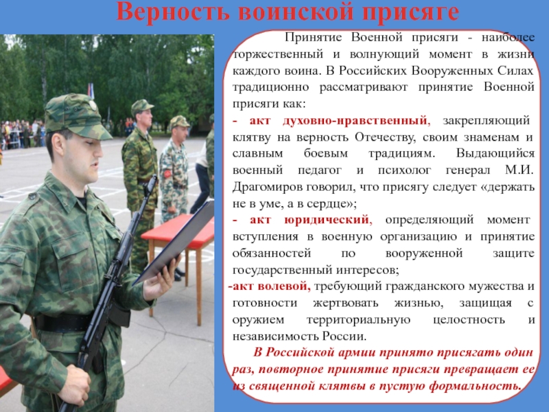 После принятия присяги в строю воины подписывали присяжные листы. В Советских ВС принятие Военной присяги молодыми воинами начали проводить у памятников боевой славы: в Волгограде - на Мамаевом кургане, в Москве - у Могилы неизвестного солдата