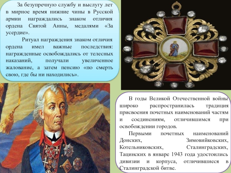 В 1807 году для нижних чинов был впервые проведен воинский ритуал награждения «знаком отличия Военного ордена» Святого Георгия (с 1913 года именовался Георгиевским крестом).