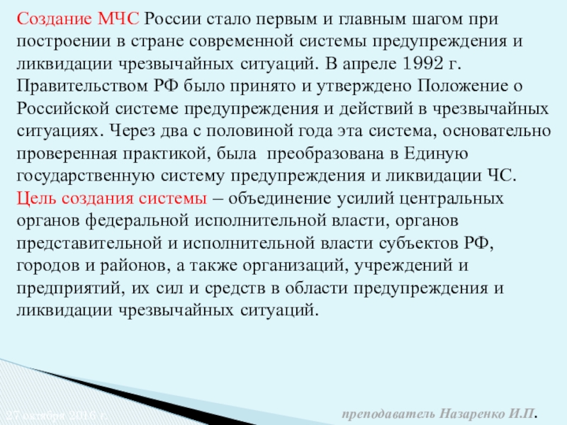 Основные задачи РСЧС:- разработка и реализация законов и других важных документов, регулирующих вопросы защиты населения и территорий от ЧС;