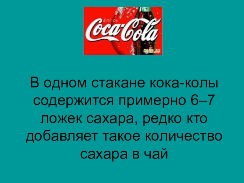Слайд 7В одном стакане кока-колы содержится примерно 6–7 ложек сахара, редко кто