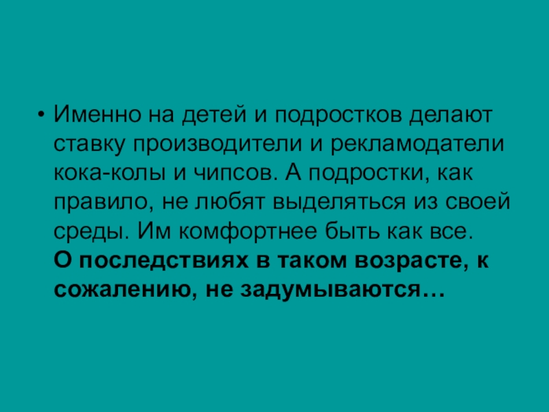 кока-колы и чипсов. А подростки, как правило, не любят выделяться из своей среды. Им комфортнее быть как все. О последствиях в таком возрасте, к сожалению, не задумываются…