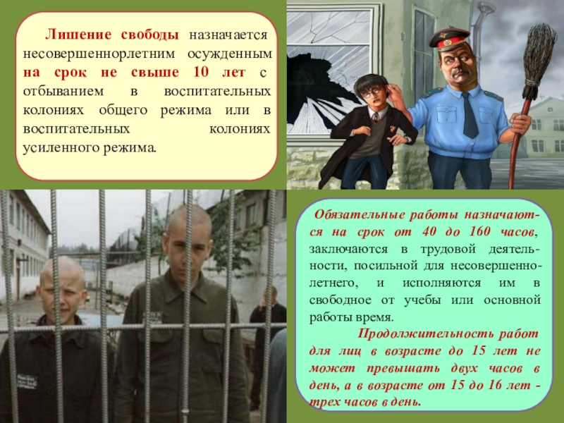 Обязательные работы назначают-ся на срок от 40 до 160 часов, заключаются в трудовой деятель-ности, посильной для несовершенно-летнего, и исполняются им в свободное от учебы или основной работы время.