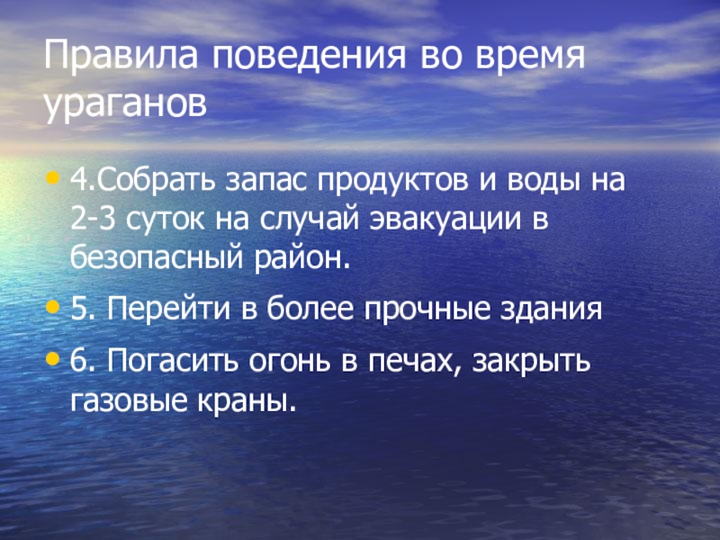 Правила поведения во время ураганов4.Собрать запас продуктов и воды на 2-3 суток на случай эвакуации в безопасный