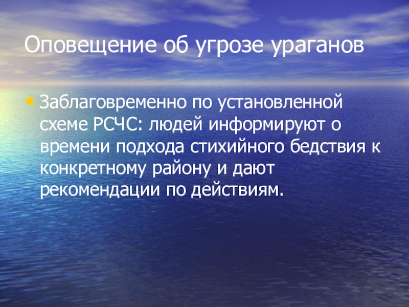 Оповещение об угрозе урагановЗаблаговременно по установленной схеме РСЧС: людей информируют о времени подхода стихийного бедствия к конкретному