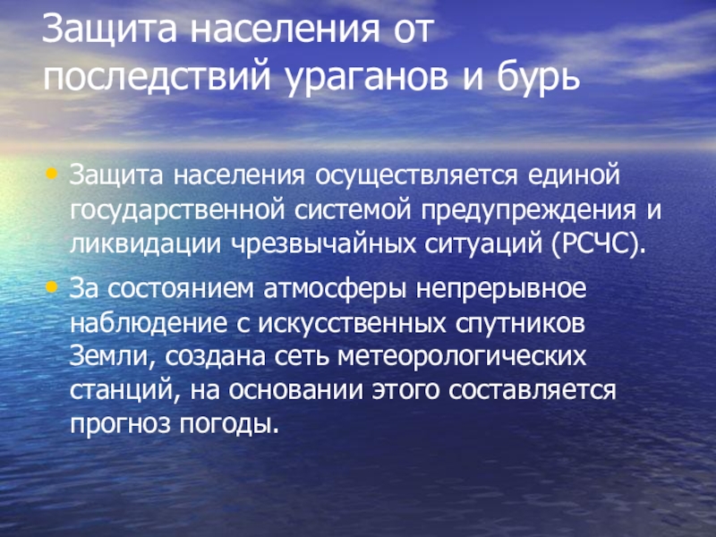 Защита населения от последствий ураганов и бурь Защита населения осуществляется единой государственной системой предупреждения и ликвидации чрезвычайных ситуаций (РСЧС).За состоянием атмосферы непрерывное наблюдение с искусственных спутников Земли, создана сеть метеорологических станций, на основании этого составляется прогноз