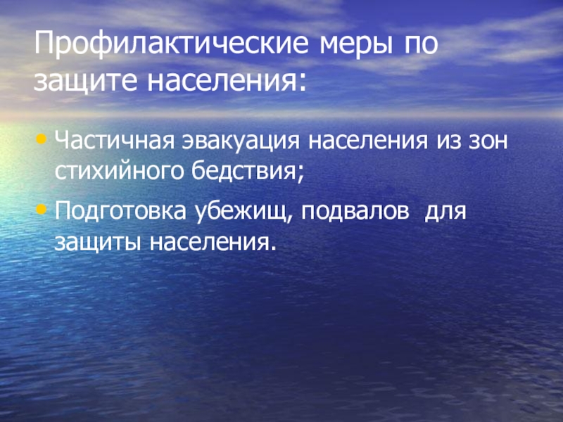 Профилактические меры по защите населения:Частичная эвакуация населения из зон стихийного бедствия;Подготовка убежищ, подвалов для защиты населения.