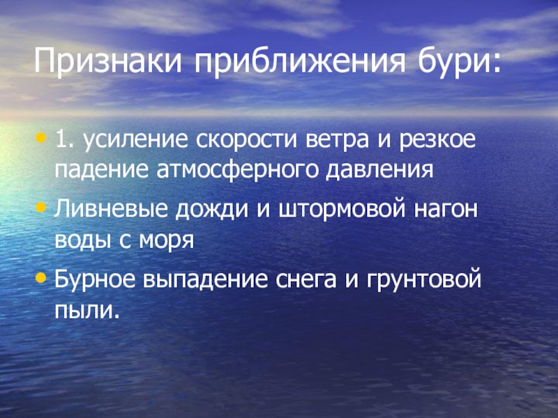 Признаки приближения бури:1. усиление скорости ветра и резкое падение атмосферного давленияЛивневые дожди и штормовой нагон воды с