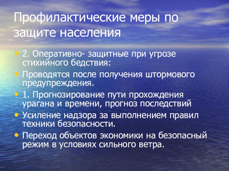 Профилактические меры по защите населения2. Оперативно- защитные при угрозе стихийного бедствия:Проводятся после получения штормового предупреждения.1. Прогнозирование пути