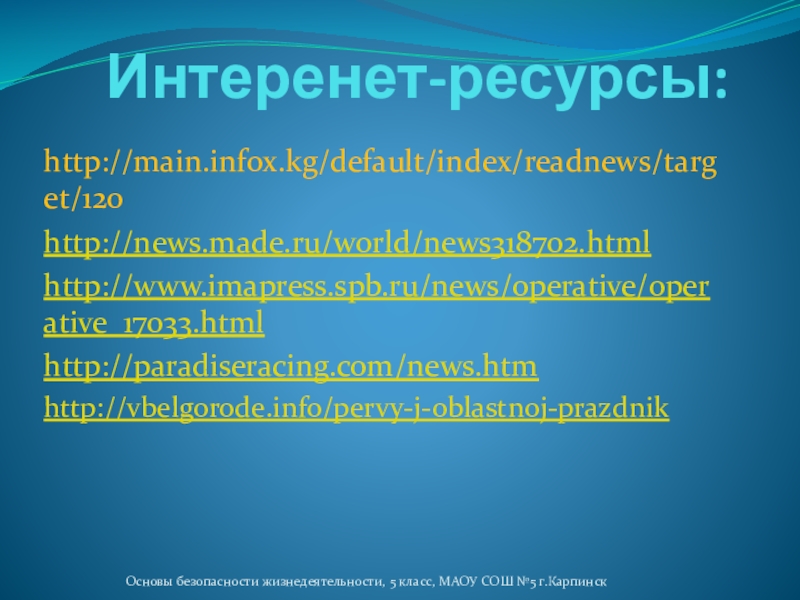 Интеренет-ресурсы:http://main.infox.kg/default/index/readnews/target/120http://news.made.ru/world/news318702.htmlhttp://www.imapress.spb.ru/news/operative/operative_17033.html http://paradiseracing.com/news.htmhttp://vbelgorode.info/pervy-j-oblastnoj-prazdnikОсновы безопасности жизнедеятельности, 5 класс, МАОУ СОШ №5 г.Карпинск